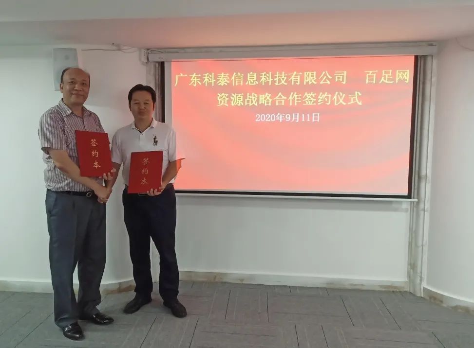 2020年9月11日,在珠海連橫企業(yè)服務(wù)有限公司的會議室,廣東科泰信息科技有限公司總經(jīng)理林漢文和廣東省山東商會副會長、廣東省山東濟(jì)南商會執(zhí)行會長、肇慶市山東商會會長、百足網(wǎng)董事長楊民軍簽署廣東科泰信息科技有限公司與百足網(wǎng)資源合作協(xié)議。